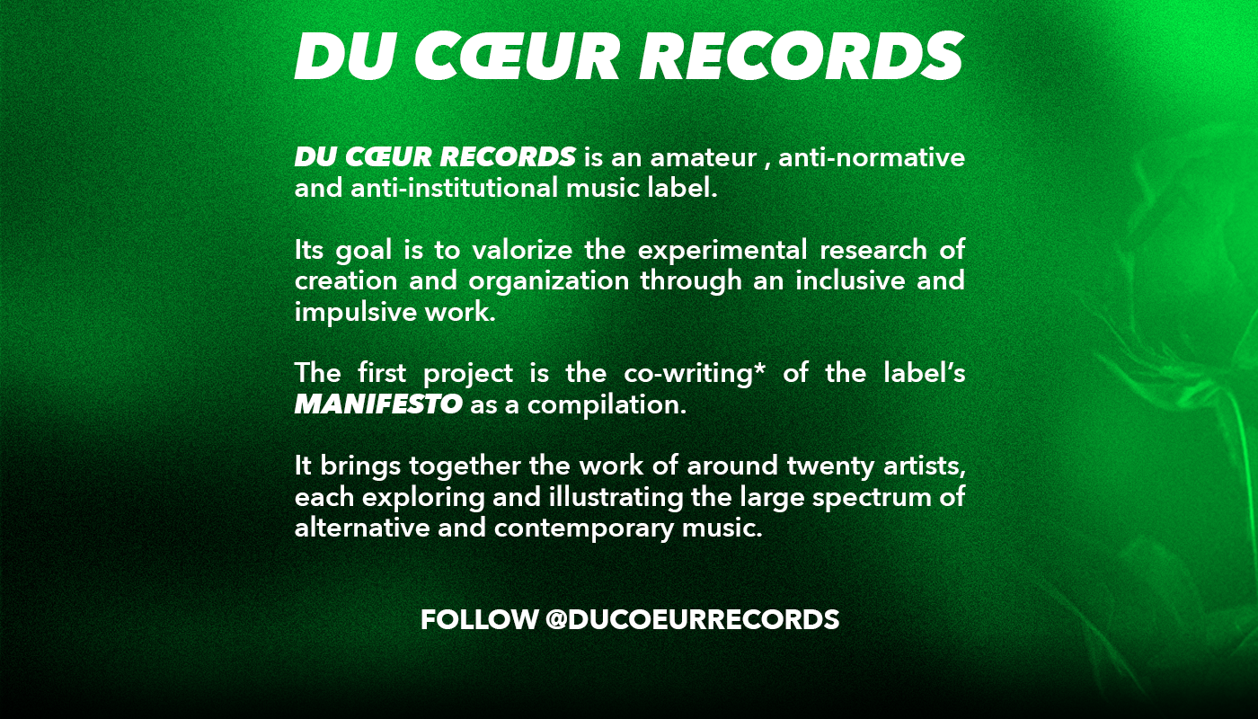 Artworks for the first Du Cœur Records release : Manifesto. DU CŒUR RECORDS is an amateur , anti-normative and anti-institutional music label. Its goal is to valorize the experimental research of creation and organization through an inclusive and impulsive work. The first project is the co-writing* of the label’s MANIFESTO as a compilation. It brings together the work of around twenty artists, each exploring and illustrating the large spectrum of alternative and contemporary music.